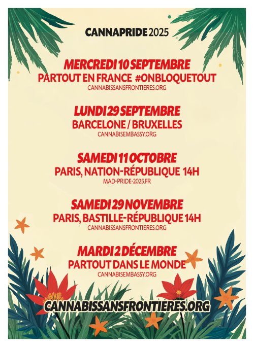 - 29 novembre : Cannapride (Paris) ; cannabissansfrontieres.org