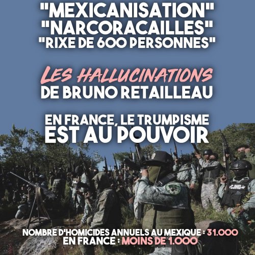 Mais revenons à Poitiers. Le fait divers est immédiatement exploité par le Ministre de l’Intérieur d’extrême droite. Bruno Retailleau parle d’une rixe de « 400 à 600 personnes », donc quasiment d’une bataille militarisée. Le Ministre ajoute : « On a le choix entre une mobilisation générale ou la Mexicanisation de notre pays car je vous assure que les narcoracailles n’ont plus aucune limite ». L’information, massivement reprise, fait effet boule de neige dans les médias des milliardaires et sur les réseaux réactionnaires.