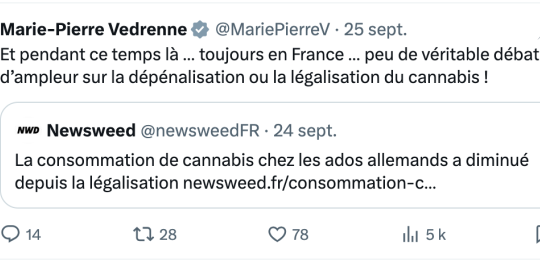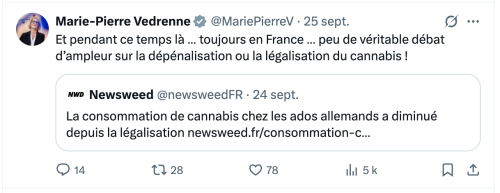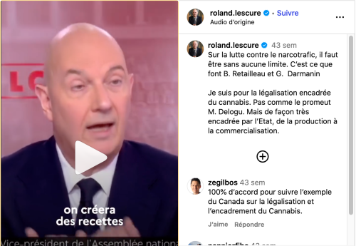 commentait les évolutions observées en Allemagne et regrettait qu’en France il y ai “peu de véritable débat d’ampleur sur la dépénalisation ou la légalisation du cannabis !”- et M. Roland Lescure, Ministre de l’Économie, des Finances et de la Souveraineté industrielle, énergétique et numérique